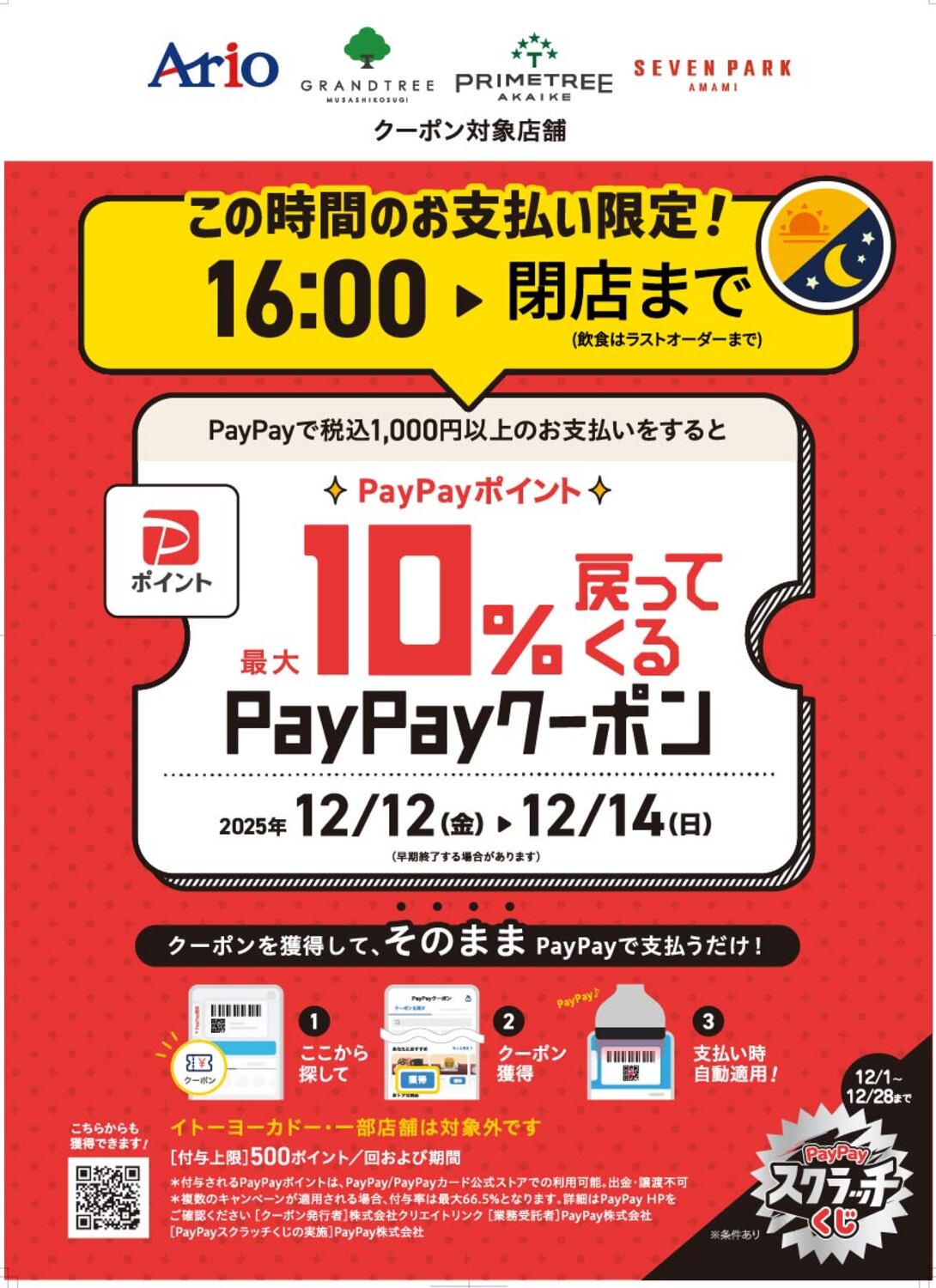 対象店舗にて16時~閉店までの時間にPayPayでお支払いすると最大10%PayPayポイントが戻ってくる!