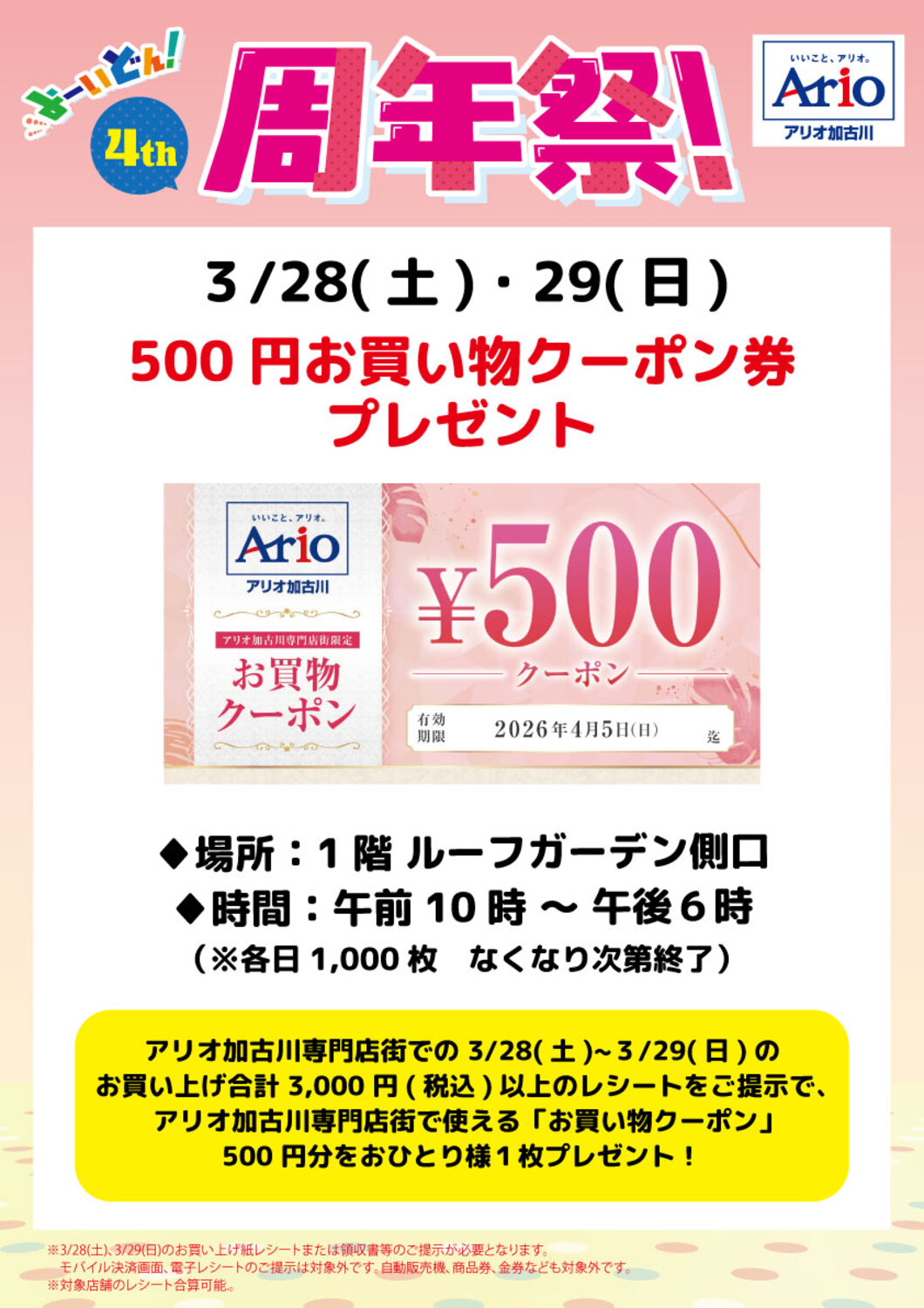 アリオ加古川専門店街での3月28日(土)~29日(日)お買い上げ合計3,000円(税込)以上のレシートをご提示で、各日先着1,000名様にアリオ加古川専門店街で使える「お買い物クーポン」500円分をお一人様1枚プレゼント!