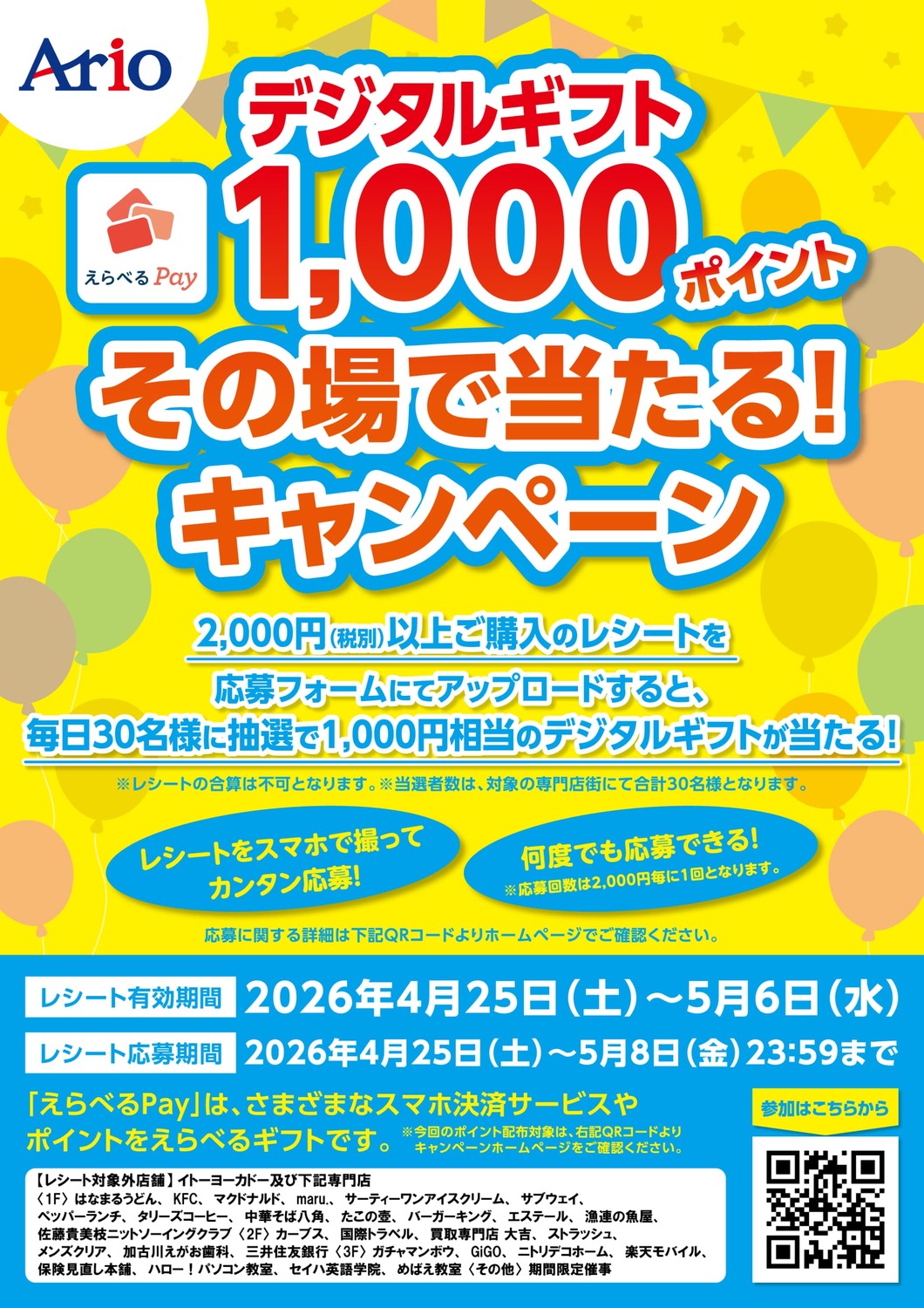2,000円(税別)以上ご購入のレシートを応募フォームにてアップロードすると、毎日30名様に抽選で1,000円相当のデジタルギフトが当たる!