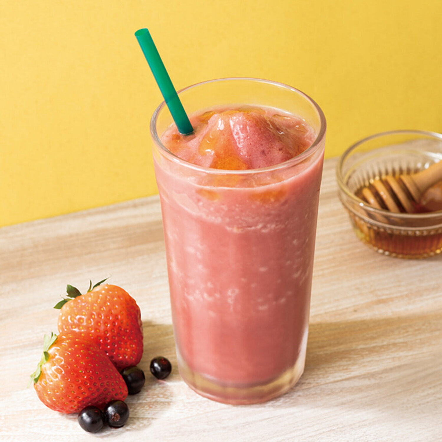 アサイーとストロベリーの爽やかで甘酸っぱい風味が広がる、フルーティなフローズンドリンク。仕上げのはちみつがやさしい甘さとコクを添える、奥行きある味わいをお楽しみください。