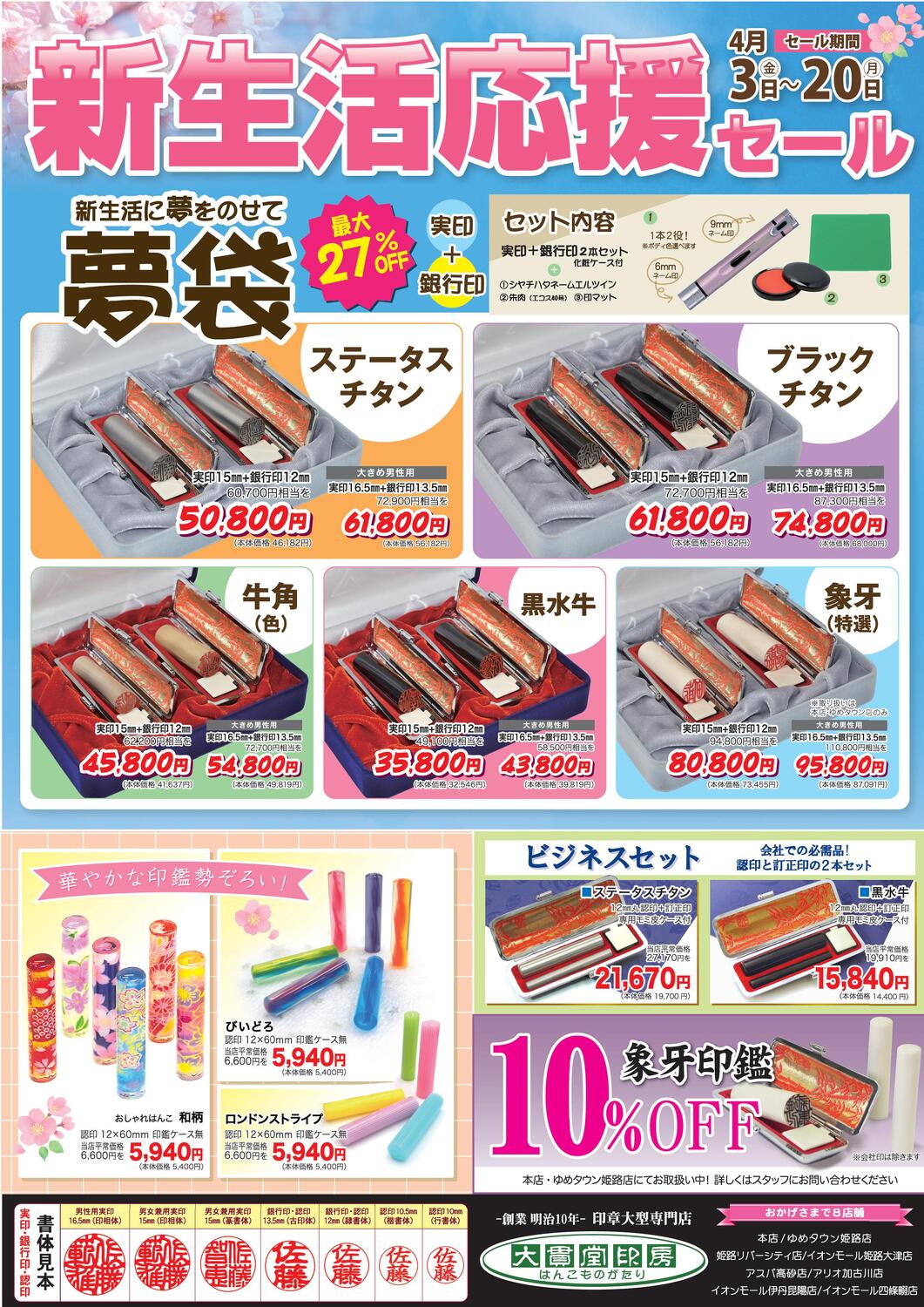 耐久性抜群【チタン】(例)実印15ミリ 37,070円を33,330円(税込)、 柔らかな色合いが女性に人気【牛角(色)】、お手頃価格で 定番の印材【黒水牛】、そして、華やかな絵柄【おしゃれはんこ】、 会社運営の強い味方の【角印・役職印】など。